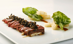 TEPPANYAKY DE SOLOMILLO DE TERNERA, CON MOJO DE TROMPETAS DE LA MUERTE Y DAIKON EN TEMPURA
