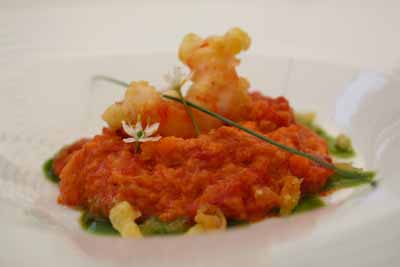 Papapomodoro con tofu de garbanzos y camarones fritos