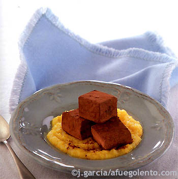 Volcar el chocolate fundido en un contendor de plástico pequeño forrado con film transparente y dejarlo enfriar en el frigorífico durante unas 3 hora como mínimo. Desmoldar el chocolate y cortarlo en dados de 2 cm de lado. Pasarlos por el cacao en polvo y dejarlos en el frigorífico hasta el momento de servir