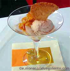 Emulsión de torta de queso, crocante de nuez y sorbete de azúcar moscovado