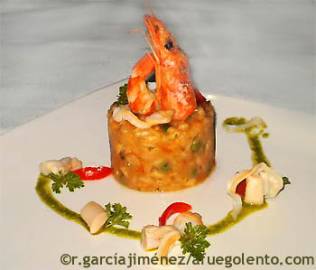Añadimos el arroz y rehogamos. Acto seguido añadimos las gambas, las navajas, el tomate seco y el perejil picado. Sofreímos bien, añadimos un vaso de vino blanco y rehogamos hasta que se evapore