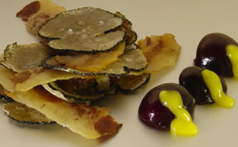 Montaremos el plato haciendo una lámina de papada, trufa, sal de escata y aceite de oliva y así las veces que convenga. Al lado de este mil hojas ponemos las cerezas cortadas por la mitad escurridas de vino y una lámina de coulis de mango por encima.