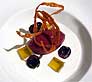 Navidad: Huevo al oro, Mero con crujiente de pistachos, y Sorbete de frutos rojos y gelatina de hierba Luisa
