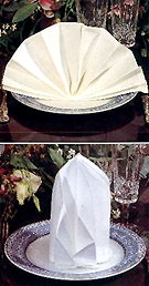 La mesa resultará mucho más mullida y acogedora si se cubre con un grueso muletón antes de poner el mantel. Éste deberá estar bien planchado, preferentemente sin marcas de pliegues (podemos plancharlo en la misma mesa). Las servilletas se pueden doblar de diferentes maneras, pero sin grandes ostentaciones. Una de las maneras más sencillas es enrollarlas formando un cilindro y seguidamente atarlas con una cinta navideña, añadiendo una piña pequeña o cualquier otro motivo navideño, también se puede incluir un regalito.