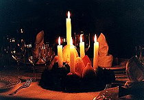Empecemos por la decoración de la casa. No hay necesidad de hacer un gran despliegue de elementos decorativos, si éstos están colocados en lugares estratégicos, será más que suficiente para proporcionar el efecto festivo y hogareño deseado. Podemos elegir entre el árbol de Navidad, el Nacimiento, las coronas para la puerta de entrada y de la cocina*, y cómo no, por las velas, que no han de faltar en ningún rincón.