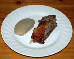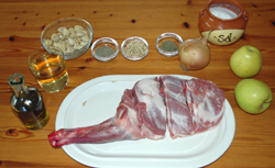 Se corta la cebolla a trocitos y se pone en el fondo de la bandeja. Se sala la paletilla y se le añade pimienta, tomillo, aceite y se embadurna bien. Se pone en la bandeja con las manzanas, los piñones y las castañas que previamente se han hervido 10 minutos. Se añade un vaso grande de vino blanco y otro de agua. Se pone al horno una hora y se tritura toda la guarnición.
