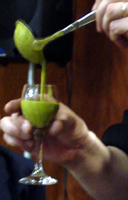 En una jarra, llevar el gazpacho verde y servir al momento sobre la guarnición.