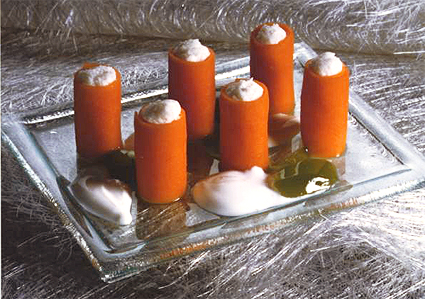 Rollitos de zanahoria: escoger unas zanahorias muy gordas y regulares. Cortar en cortafiambres unas rodajas muy finas. Poner en el fuego un almíbar con 1 litro de agua + 400g de azúcar. Cuando hierva, escaldar las rodajas de zanahoria de 1 a 2 min. La zanahoria debe conservar una textura flexible y crujiente al mismo tiempo. Como podéis deducir fácilmente, este es un sistema de coccion típicamente de cocina, recordando la cocción de la pasta al dente.