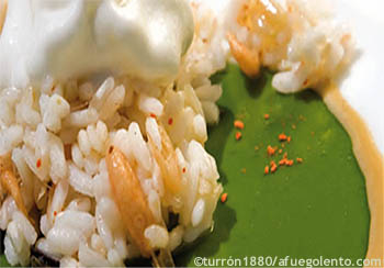 Necesitamos 250 g de nata y Pimentón de hojilla. Poner el arroz caliente sobre el agua de acelga gelificada, dejando un hueco en la parte superior. Poner en un sifón la mezcla de leche y queso de cabra con la nata y un par de cargas de gas, y montar un poco de espuma de queso en el hueco del arroz. Acabar el montaje con el turrón líquido y un poco de pimentón de hojilla.
