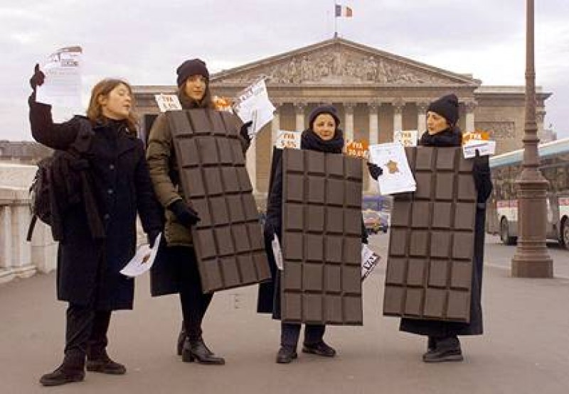 Mujeres disfrazadas de tableta de chocolate protestaron frente a la Asamble Nacional de París, el pasado mes de diciembre, contra el incremento del IVA (VAT) sobre el chocolate que ha subido del 5,5% al 20,6%.