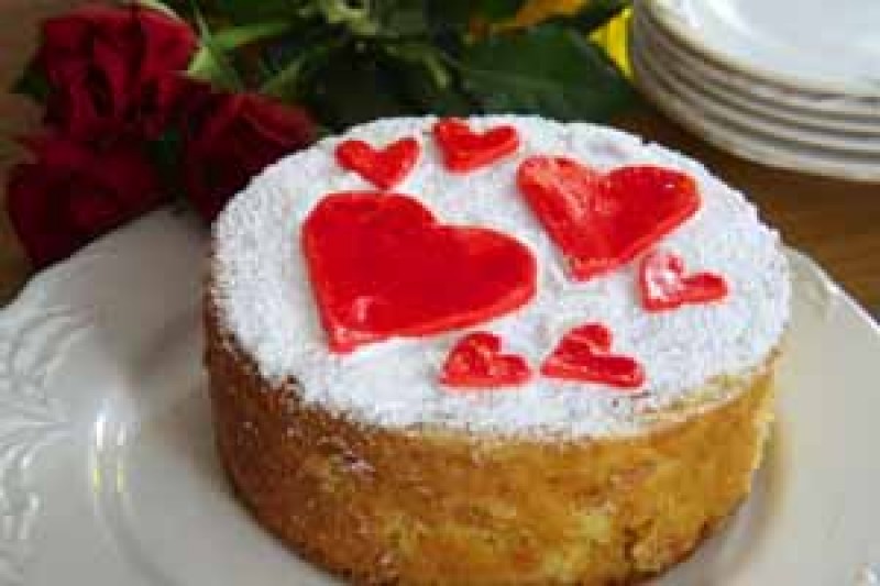 A modo de decoración, glasear la superficie ligeramente con dulce de caramelo. Cortarlo en forma de corazones de diferentes tamaños. Pintar los corazones con colorante rojo con una brocha pequeña. Para terminar, espolvorear la superficie del bizcocho con azúcar glas y colocar los corazones encima. Servir con frambuesas frescas y –si gusta– con crema. No olvidar el toque final, rosas rojas.