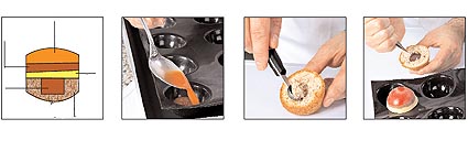 Ahuecar una semiesfera de dacquoise de avellana jengibre. Agregar la salsa de chocolate. Colocar la semiesfera por encima.