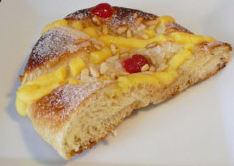 Tiene que quedar de un grosor aproximado de œ centímetro. Pon las frutas confitadas y los piñones pon encima, vuelve a taparla con el paño y deja que vuelva a subir.