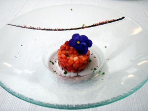 Tartare de fresones con infusión de rosas y violetas