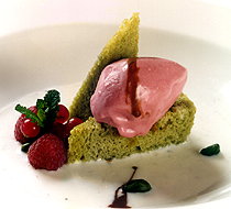 Cubrimos el fondo del plato con lasopa de coco y vainilla. Sobre ella colocamos el bizcocho de pistacho en forma de pirámide. Para finalizar, colocamos el helado de frutos rojos sobre el bizcocho.