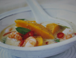 Llevar el caldo de pollo a ebullición, agregar la calabaza cortada, la pasta de gamba, la leche de coco y el azúcar.