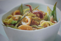 Al momento del pase decorar con unas colas de gambas, chili fresco y hojas de albahaca.