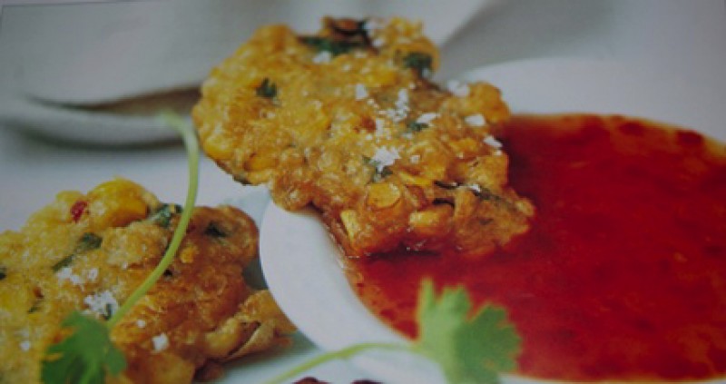Tortita tai de maíz con salsa de chili dulce y cilantro