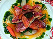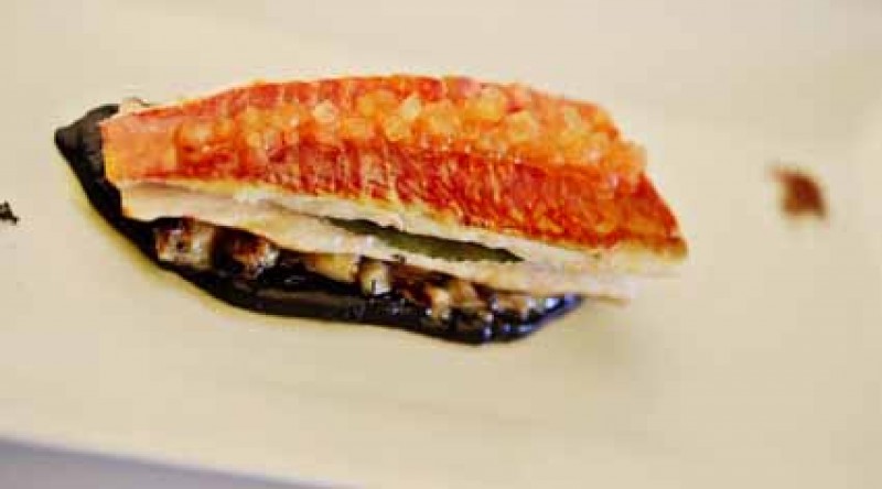 Poner a continuación una cucharada de puré de aceitunas en el platito y encima el lomo de salmonetes, por encima el trampó y terminar con un poco de cebollino picado y sal gruesa.