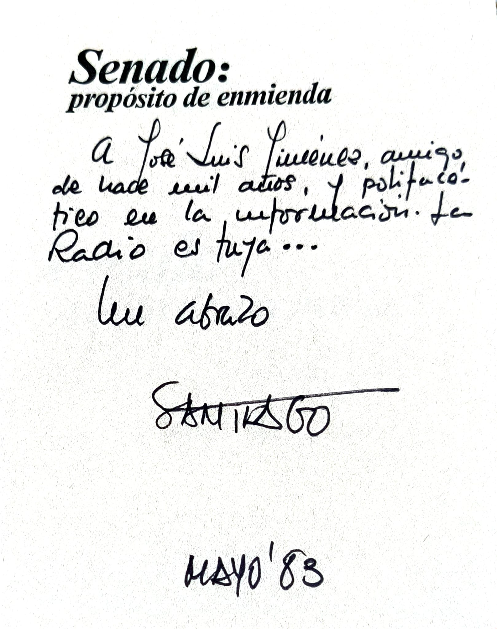 En el interior del hemiciclo se encontraba mi buen amigo y colega Santiago López Castillo, que estaba efectuando la transmisión de investidura de Calvo Sotelo para TVE. Reflejó las tensas horas, con todo lujo de detalles, que le tocó presenciar, en su libro Senado: “propósito de enmienda” en la capítulo Antes que el divorcio llegó Tejero. Y que tuvo la amabilidad de dedicármelo el día de la presentación del mismo.