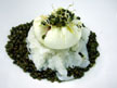 Huevo ahumado, esqueixada de bacalao y lenteja del Puy