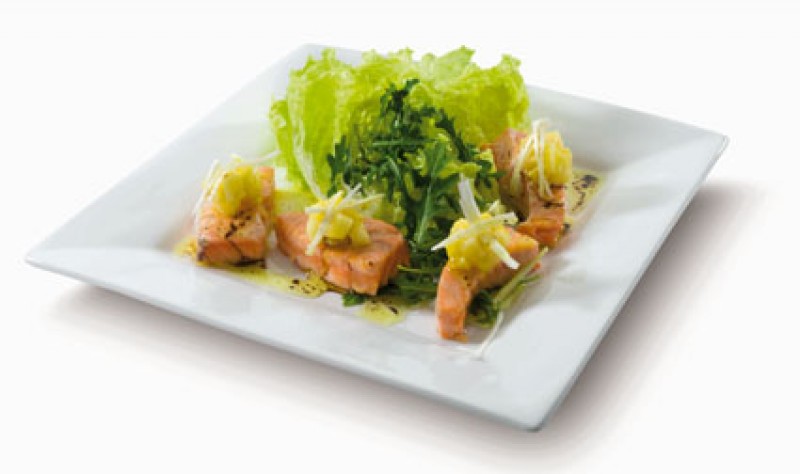 El Salmón de Noruega nace y se cría en pleamar, en las aguas claras y puras de los fiordos noruegos, perennemente enfriadas por la fundición de los hielos. ¿Cómo podemos servirlo en la mesa? La verdad..., hay tantas maneras de preparar y disfrutar del salmón, como fiordos hay en Noruega. Una de ellas, como nos sugiere Norge, es en forma de ensalada