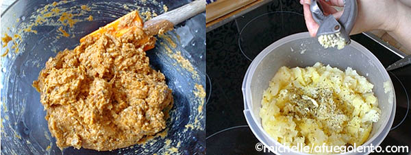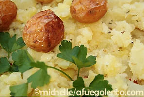 Hacer una Tombée de patatas con cinco piezas grandes cocidas y aplastadas a tenedor con hierbas, especias y dos dientesde ajo picado.