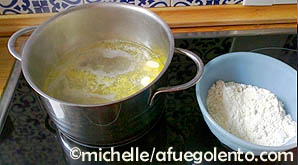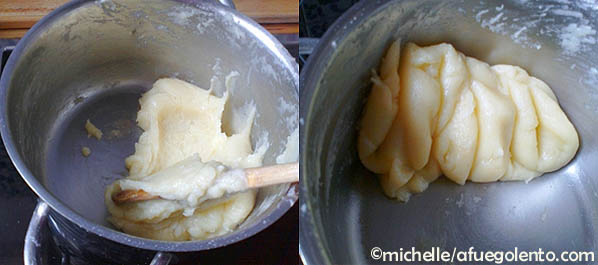 Hervir el agua con la mantequilla, cuando esta ha derretido, se saca del fuego y se echa la harina de golpe, se menea con mucha energía con ayuda de una cuchara de madera hasta obtener una bola de masa que se desprende de las paredes de la cazuela.