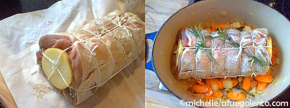Colocar encima la pieza rellena, tapar la cazuela y hornear a 180ºC durante 50 mn.
