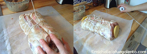Atar desde el centro hacia los extremos y colocar una rodaja de patata en cada extremo para que no se salga el relleno.