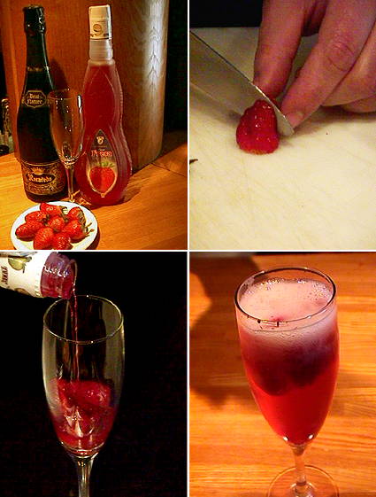 Se prepara directamente en una copa de flauta. Se ponen dos fresas limpias y troceadas o diez fresitas silvestres, se añade tres partes de licor de fresa y siete partes de cava brut helado.