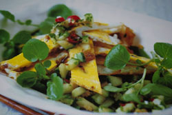 Al momento de emplatar le colocaremos el cilantro picado y los brotes, de ser necesario se pueden hacer una vinagreta de zumo de lima y aceite de piñones.