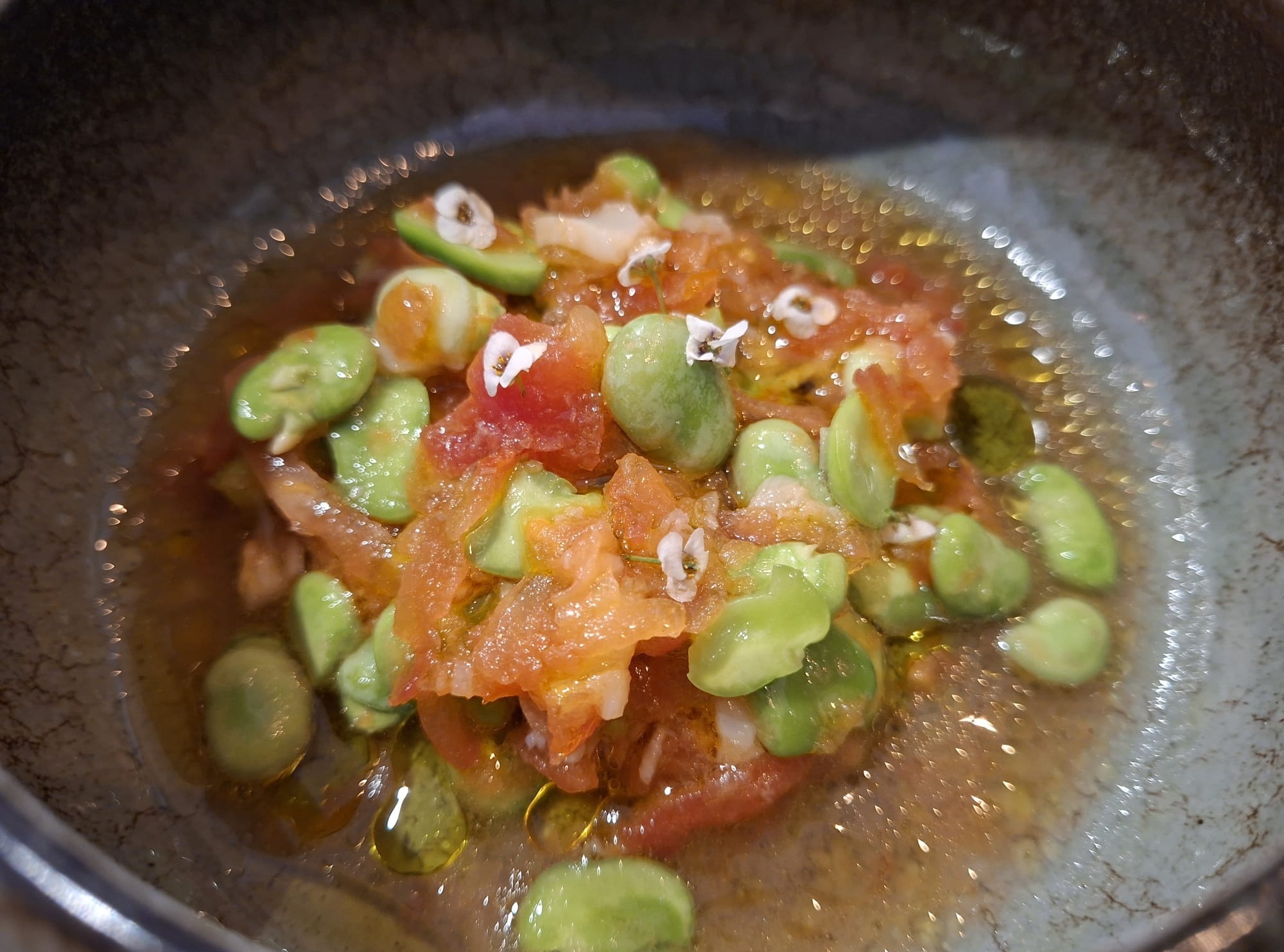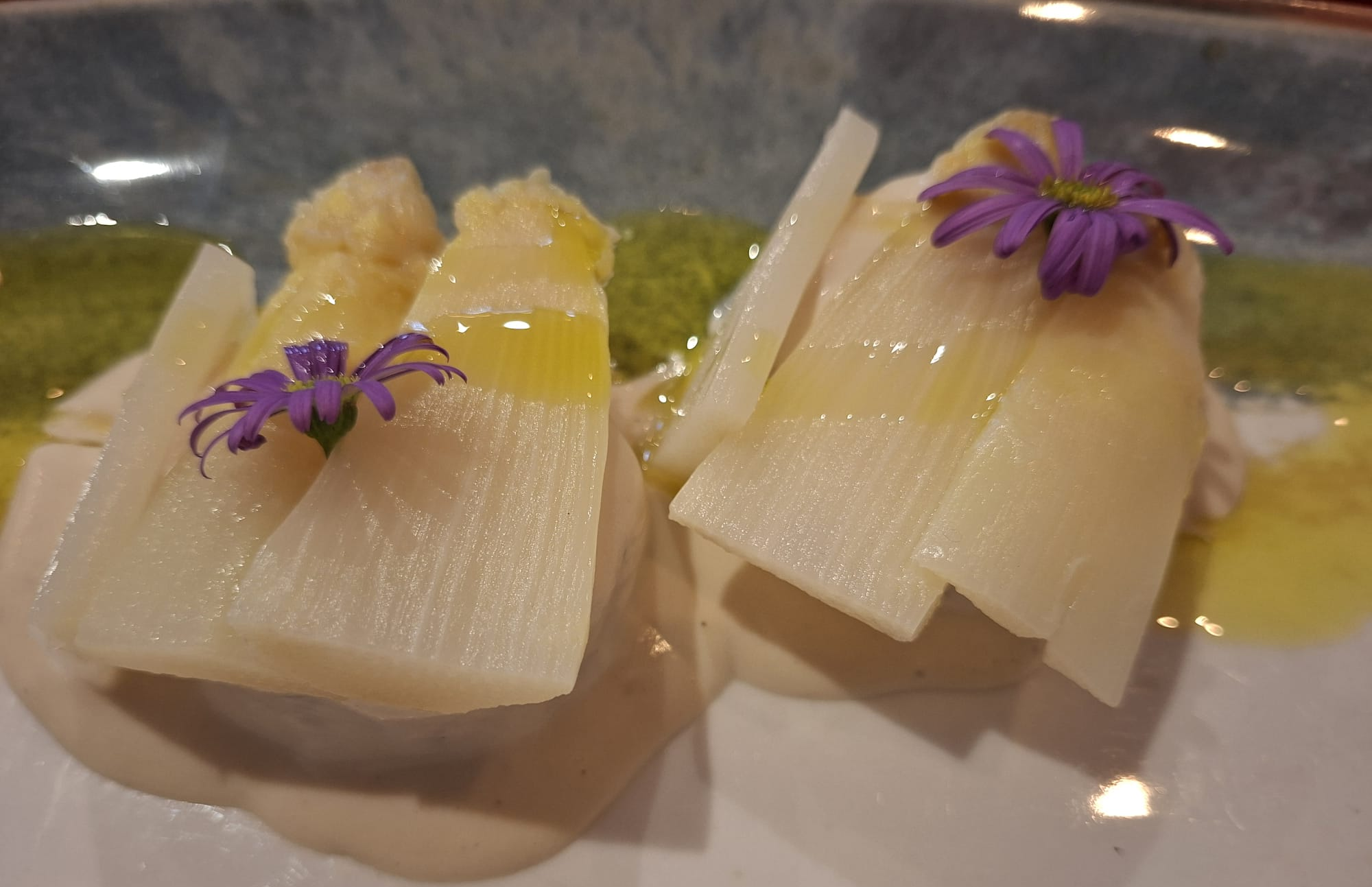 La experiencia comenzó con una exquisita selección de quesos que ya anticipaba lo que vendría después. A partir de ahí, un desfile de platos que eran puro respeto al producto y creatividad bien entendida. Probé una ensalada de habitas frescas con bacalao y cebolletas que rozaba lo sublime. Después, unos impresionantes espárragos blancos de Bedmar, de tamaño XXL, acompañados de una delicada beurre blanc sobre medallones de hueva de merluza. Una combinación que hablaba por sí sola.