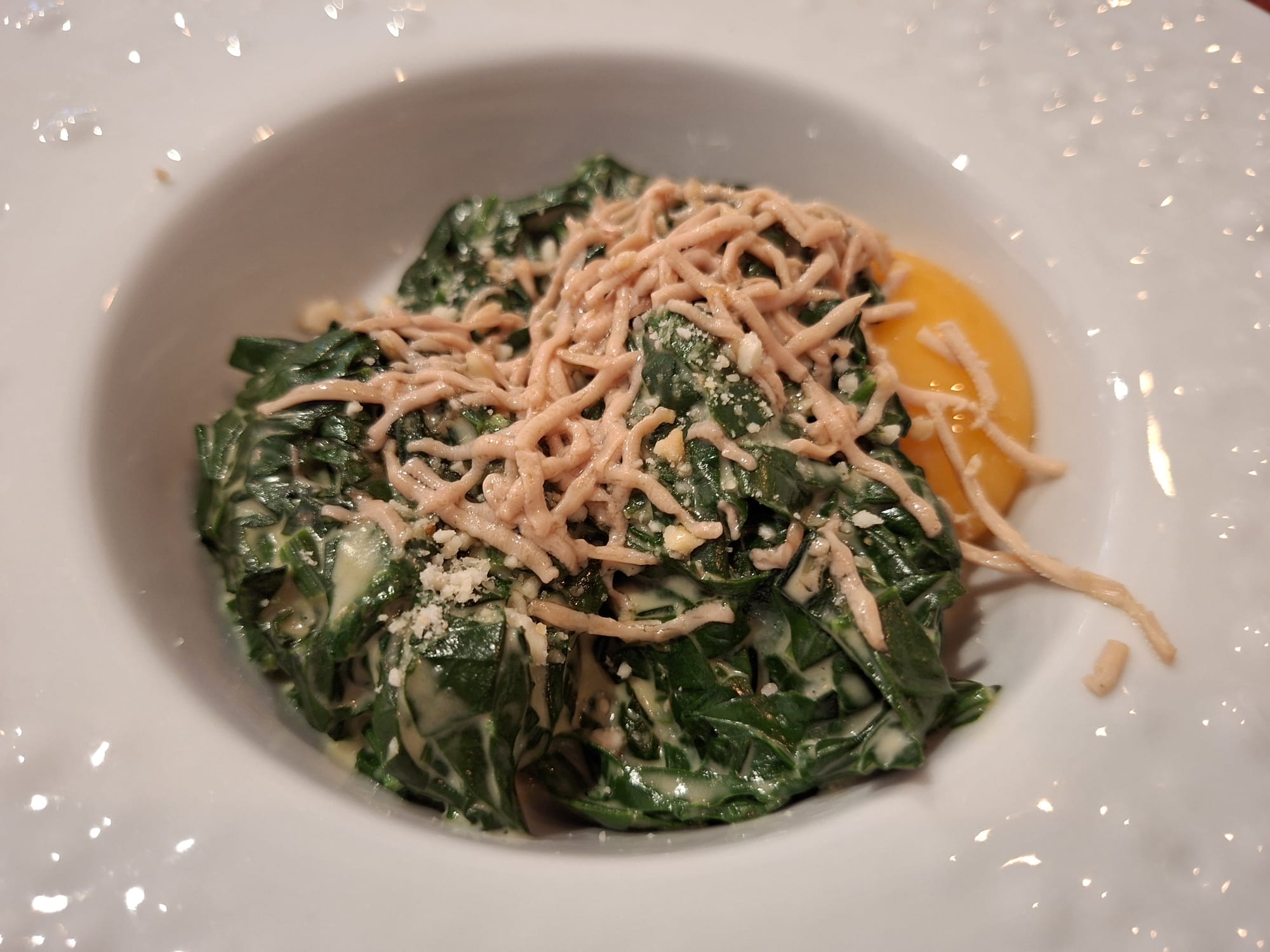 Las espinacas a la crema de foie y boletus fueron otro momento memorable. Intensidad, equilibrio y textura en un plato que no se olvida. Y cuando parecía que ya nada podía sorprender, llegó un arroz caldoso con chipirones y zamburiñas que era, literalmente, una locura de sabor.