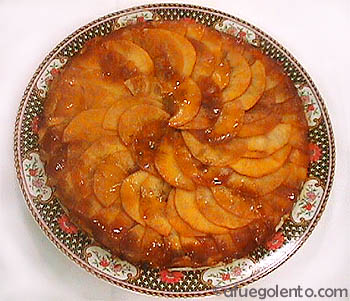 Con un rodillo, extendemos la lámina de hojaldre, dándole forma del molde sobre una mesa enharinada (no deberá cubrir las paredes del molde, sólo cubrir su base). Colocamos el hojaldre sobre la base del molde, pinchamos la masa con un tenedor, la pintamos con aceite o mantequilla fundida y espolvoreamos por encima azúcar glass. Horneamos hasta que el hojaldre empiece a tener un color dorado. Sacamos del horno y repartimos por encima del hojaldre las láminas de manzana, solapándolas. Sobre ellas esparcimos la compota/confitura de manzana y el jugo de marinar las manzanas. Pintamos por encima con un poco de mantequilla y horneamos hasta que la manzana esté tierna