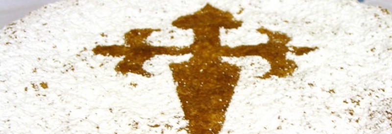 Hay que esperar hasta el año 1838 para que aparezca el primer libro de recetas en el que se recoge la fórmula para lograr la Tarta de Santiago y hasta el año 1924 para que en su superficie se dibuje la Cruz de Santiago, símbolo de los caballeros cruzados cuyas tres flores de lis representan al Apóstol.