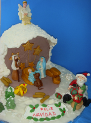 Es una tarta montada en una base de corcho. El bizcocho es la parte de atrás del pesebre. Se realiza de esta manera para que una vez que se proceda a comer el bizcocho, las figuras (de pasta de azúcar) se podrán utilizar el resto de la Navidad de adorno.