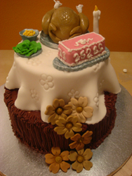 El pavo, el postre, el mantel, las flores y los acompañamientos del pavo se han realizado en fondant de distintos colores. El brillo del pavo se consigue con un poco de almíbar.