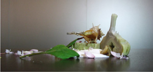 -Disponer en el plato todos los ingredientes: Las alcachofas, las flores, las almendras, la carne de caracol y el yogurt de oveja guirra, así como las hojas de acelga y ficoide.