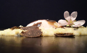 -Cortar las trufas con una mandolina y añadir el 75 % al falso risotto, cocer un minuto más y añadir la mantequilla. Mezclar con prfusión, del mismo modo que si estuviéramos mantecando un risotto. Rectificar de sal.