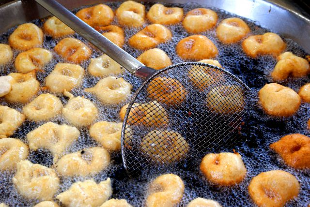 En una sartén poner el aceite y una vez caliente, estrujar la pasta con una mano dejando que salga una pequeña porción por encima y con los dedos índice y pulgar de la otra mano, previamente mojados con agua, hacer un agujero a esta pasta que ha sobresalido y ponerlo en la sartén. Luego bajar intensidad del fuego a fuego medio y cuando estén dorados por una cara, darles la vuelta y una vez fritos por las dos caras sacarlos escurrirlos del sobrante de aceite y cuando estén tibios espolvorearlos de azúcar o miel .