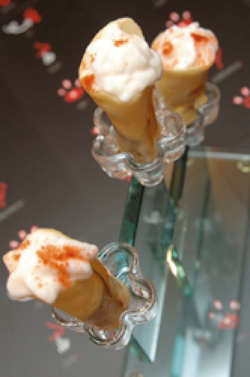 Una vez tenemos la patata con el chorizo, con la ayuda del sifón pondremos un poco de espuma de crema de alubia blanca. El plato se decora con pimentón y sal maldon, rociando en la base un poco de la reducción de la sidra.