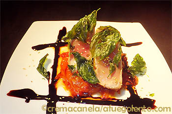 Disponer en el plato los tomates confitados encima el lomo de atún partido por la mitad y decorar con las hojas e espinacas fritas, el sésamo y el caramelo de Módena