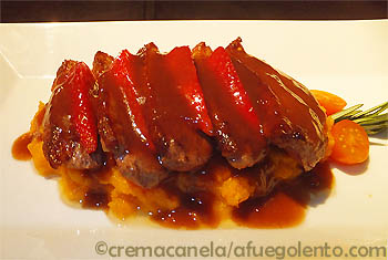 Magret de pato con puré de boniatos y salsa de frutos rojos