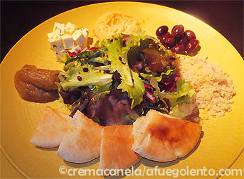 Disponemos en el centro del plato, y alrededor vamos poniendo la mousse de berenjena, el hummus de garbanzos, el queso feta, el cous cous y las aceitunas