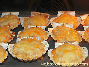 Cogemos las conchas, las rellenamos con la bechamel de pollo y jamón, y espolvoreamos con pan rallado. Sobre el pan rallado repartimos el queso rallado y, en cada concha, ponemos unas puntitas de margarina. Gratinamos en el horno hasta que estén doradas y servirmos
