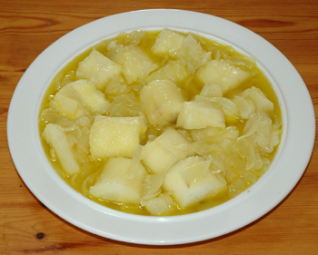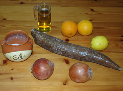 Se corta a rodajas la yuca y se pone a cocer hasta que esté blanda. Se cuela y se pone en una fuente. Se pone un vaso de aceite en un cazo con la cebolla cortada. Cuando esté blanda se le ponen dos naranjas y un limón escurridos, que hierva un poco y se le pone por encima de la yuca.