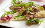 Pollo crujiente de corral con pasta filo relleno de setas y espinaca, ensalada y patata asada al romero 23-05-2016