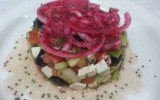 Ensalada griega con cebolla remolachada y amapola .Primero tener un biberon con aceite de oliva virgen llenandolo 2/3 y hechamos dentro una cucharada de oregano y la mitad de pimienta recien molida para dar mas aroma y lo dejamos macerar todo lo que podamos depende de la urgencia que tengamos 10 minutos... 29-10-2016