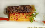 Una sabrosísima tapa que, si la presentamos en otro formato, puede convertirse en un plato completo: lomo confitado de cerdo sobre huevos revueltos con patatas 27-03-2012